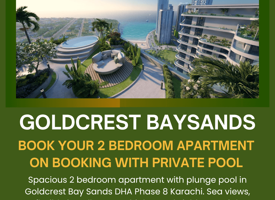 Step into upscale living with this 2 bedroom apartment for sale in Goldcrest Bay Sands 1, ideally located at HMR Waterfront, DHA Phase 8, Karachi. With a private plunge pool, panoramic sea views, and high-end design, this apartment offers modern comfort in an iconic twin-tower project by the renowned Giga Group.