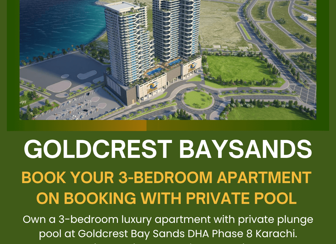 Welcome to your dream 3-bedroom beachfront residence in Goldcrest Bay Sands 1, DHA Phase 8, Karachi. This premium high-rise apartment features a private plunge pool, expansive balconies, and elegant interiors designed for modern families seeking class, convenience, and coastal serenity.