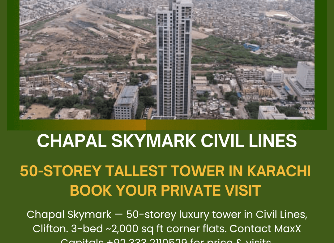 Chapal Skymark – 50-storey Luxury Residential Tower by Chapal Builders is the definitive address for luxury high-rise living in Civil Lines, Clifton, Karachi. Positioned as a landmark tower, Chapal Skymark delivers corner-facing, spacious apartments with panoramic city views, world-class amenities, and rock-solid infrastructure — ideal for buyers searching for Chapal skymark karachi, Chapal skymark flat for sale, or investors looking at Chapal skymark price and Chapal skymark rent potential. As MaxX Capitals Real Estate Experts In Karachi (authorized agent), we present an exclusive opportunity to own a slice of Clifton’s skyline.