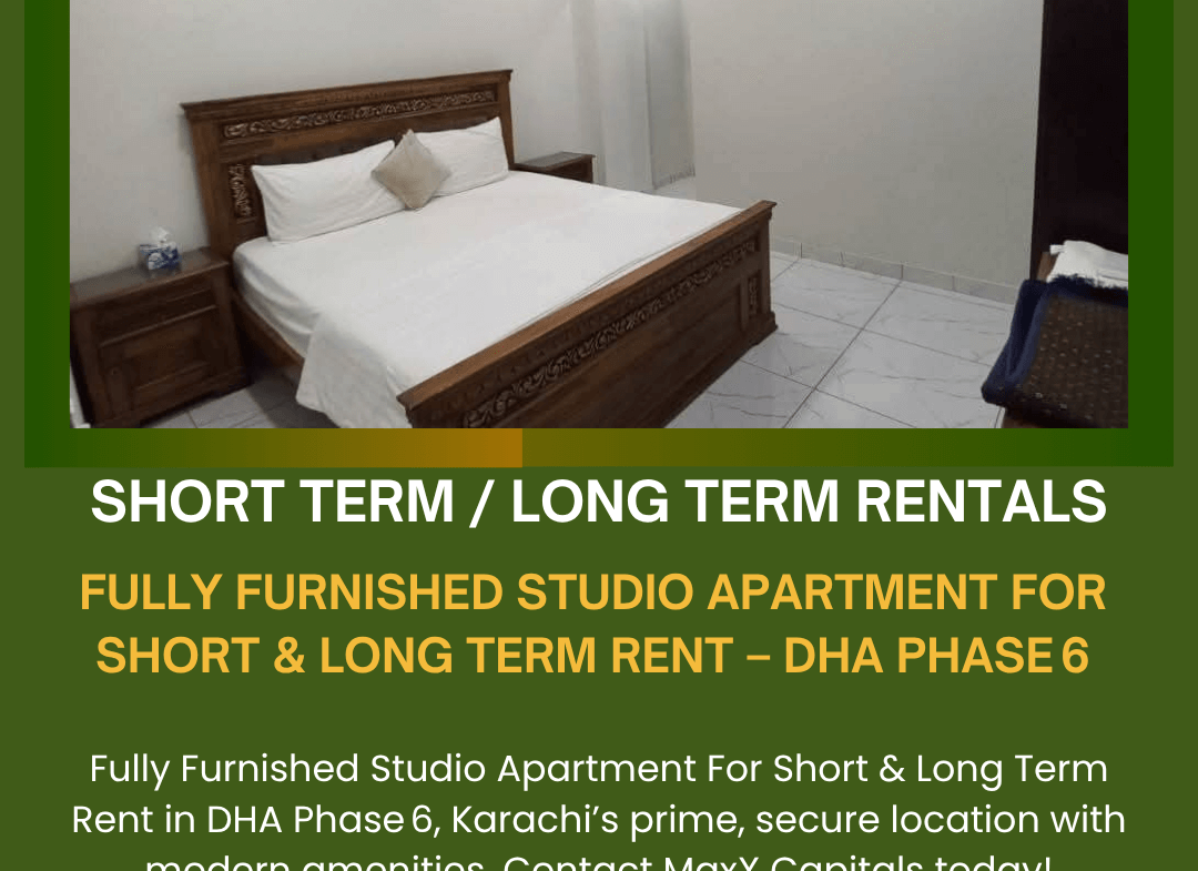 Discover the perfect Fully Furnished Studio Apartment For Short & Long Term Rent in the heart of DHA Phase 6, Karachi. Managed by MaxX Capitals: Real Estate Experts, this modern studio offers a secure, stylish and ready-to-move living space—ideal for professionals, singles, small families, or corporate stays.