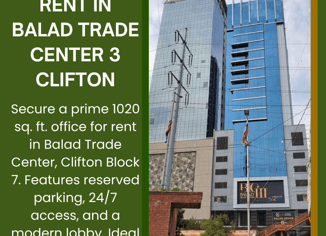 Welcome to Balad Trade Center, a landmark corporate office building strategically positioned in the heart of Karachi’s most sought-after commercial district. This listing presents a premier Office For Rent in Balad Trade Center 3, a spacious 1020 sq. ft. unit with dedicated parking in the prestigious Clifton Block 7, Karachi.[1] Designed for excellence, Balad Trade Center offers a sophisticated and professional environment tailored to meet the dynamic needs of modern businesses. With its contemporary glass elevation, modern lobby, and panoramic views of the city, this corporate building is the perfect address for enterprises aiming for growth and prestige.