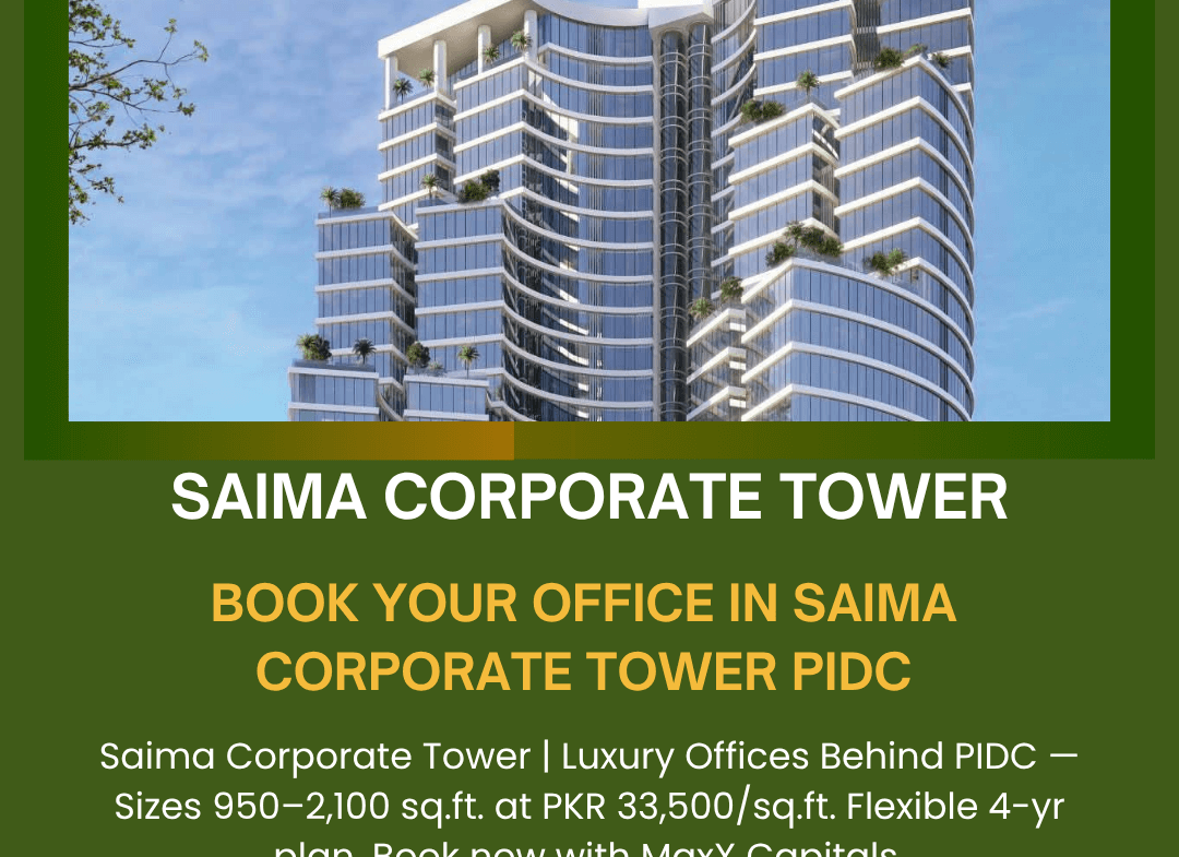 - Project marketed as Saima Corporate Center — Pre-Launch by Saima Builders. Sales support and promotion handled by MaxX Capitals. Developer reputation highlighted (Metro Builders / Metro Group mentioned in promotional notes). Buyers should verify developer credentials and project documentation at the time of booking.